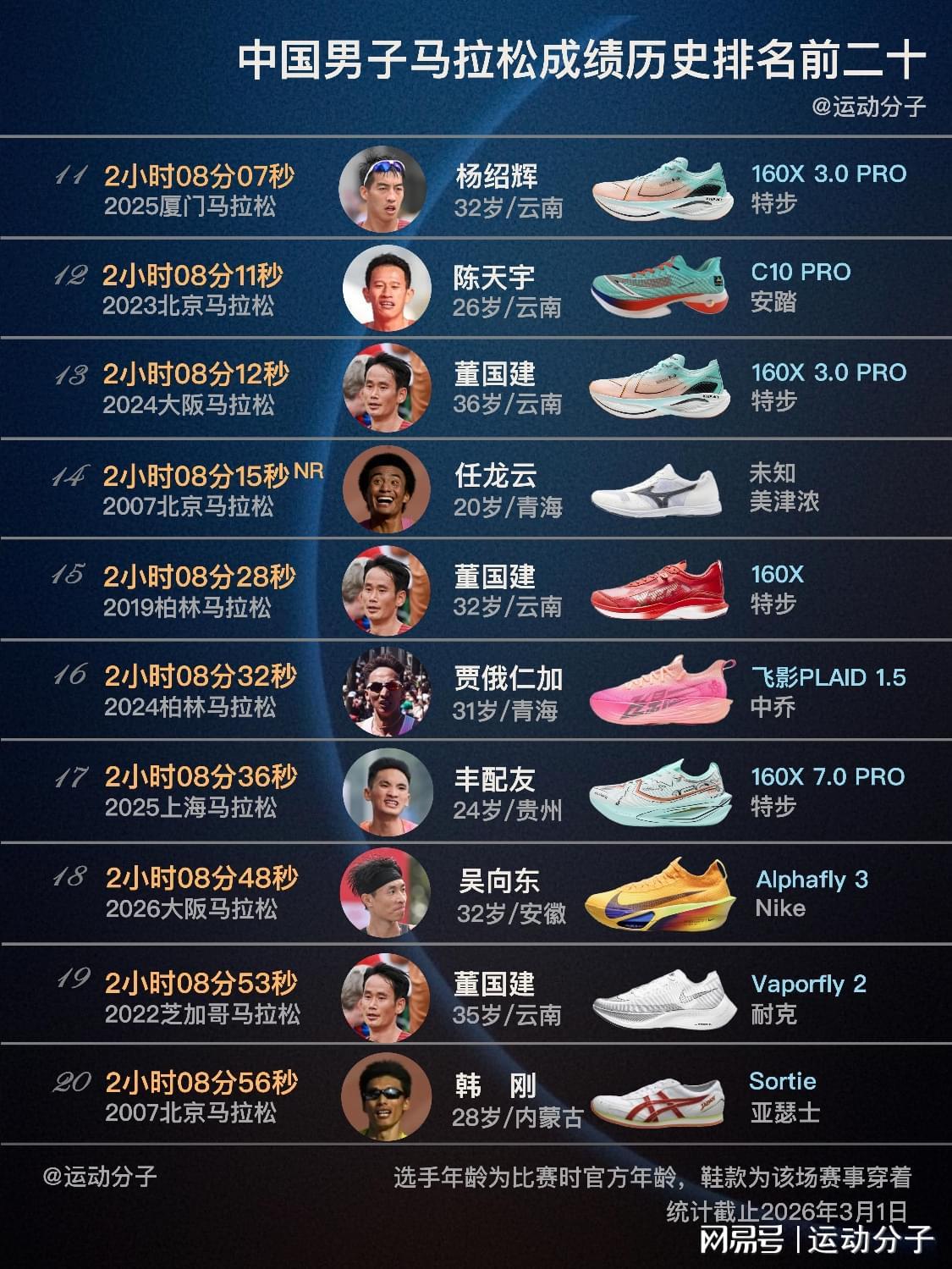 中国男子马拉松历史前20快成绩,来自9位运动员。现役7人,合计贡献14个:刚刚刷新国家纪录的最强00后丰配友,和杨绍辉都是4次上榜,杨绍辉也是当下中国跑进210大关次数最多的人(6次);中国马拉松一哥何杰3次上榜,包括两次国家纪录;董国建3次。董哥5次跑进过210,生涯后期仍保持了极强竞争力。——何杰、丰配友、杨绍辉、吴向东、陈天宇、董国建、贾俄仁加这些现役...